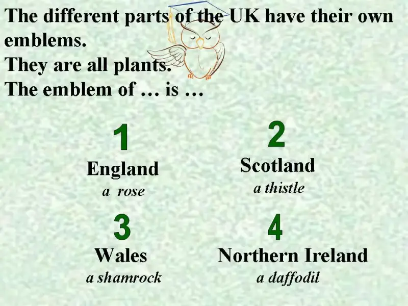 IX. В следующем задании учащиеся вспоминают эмблемы составных частей Соединенного Королевства. На экране появляются (на доску вывешиваются) эмблемы каждой из этих стран (слайд 12) «ThedifferentpartsofBritainhavetheirownemblems. The emblem of … is … Do you agree with me?»