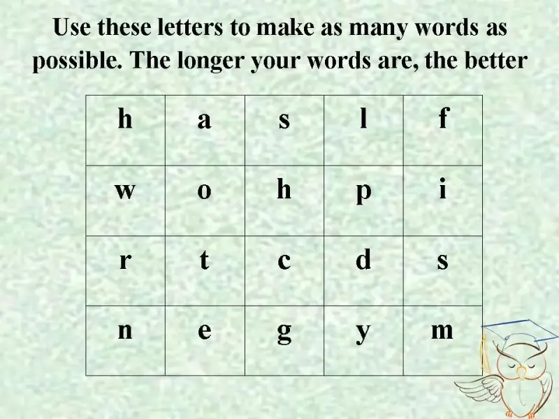 Второй вариант: командам предлагается любое длинное английское слово, например sportsmanship. Задача команд - составить из этого слова как можно больше слов, затем команды по очереди читают составленные слова, одинаковые вычеркиваются. У кого окажется больше не вычеркнутых слов, тот и победитель.