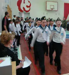 Завершающий этап - "Статен в строю, силен в бою", в котором учащиеся 1 классов читали стихи, учащиеся 2 классов - инсценировали фронтовую песню, учащиеся 3-4 классов выполняли строевые упражнения и маршировали с исполнением песни на тему военных лет: