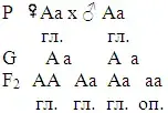 3. Проводим анализ скрещивания. В F2 произошло расщепление: по генотипу - 1 (АА) : 2 (Аа) : 1 (аа); по фенотипу 3 (желтосеменные растения) : 1 (зеленосеменные растения).