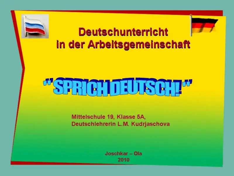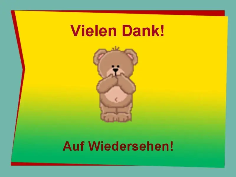 - Herzlichen Dank liebe Kinder. Wir haben heute viel gearbeitet und ich wünsche euch Gesundheit, Glück und gute Noten. Наше занятие подoшло к концу. Чему мы научились сегодня на занятии?