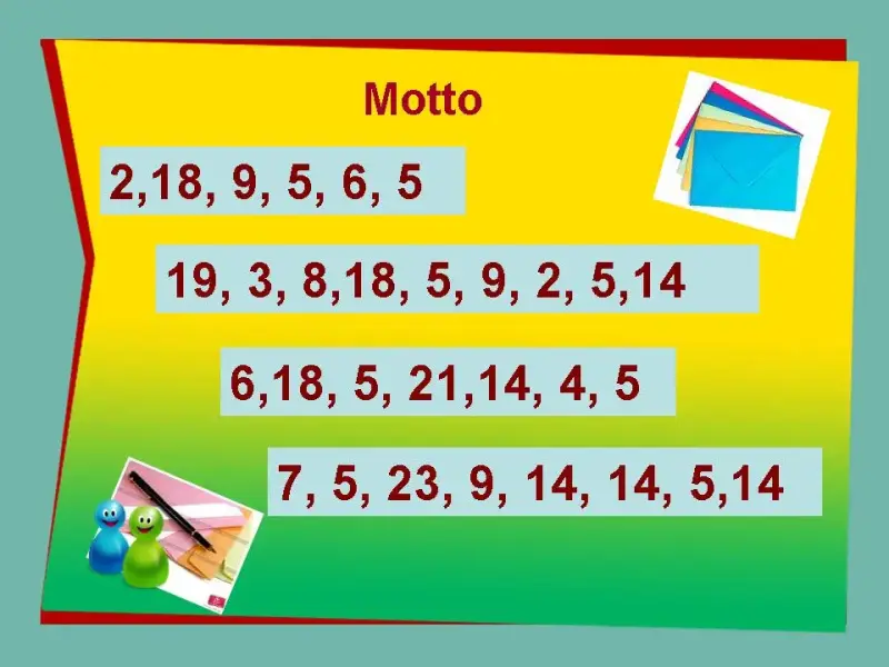 - Guten Tag liebe Gäste und Kinder! Ich freue mich sie zu sehen Was machen wir heute also in unserem Unterricht? Oh! Vieles! Wir sprechen viel Deutsch, raten, hören Informationen und Musik von Franz Schubert, Robert Schumann, erzählen über unsere Brieffreunde, lesen Briefe und schreiben Antworten, singen ein Lied und basteln Blumenherzen und Briefumschläge. Wir haben heute eine ungewöhnliche Stunde. Die Stunde hat ein Motto. Wer liest dieses Motto? Code hilft euch.