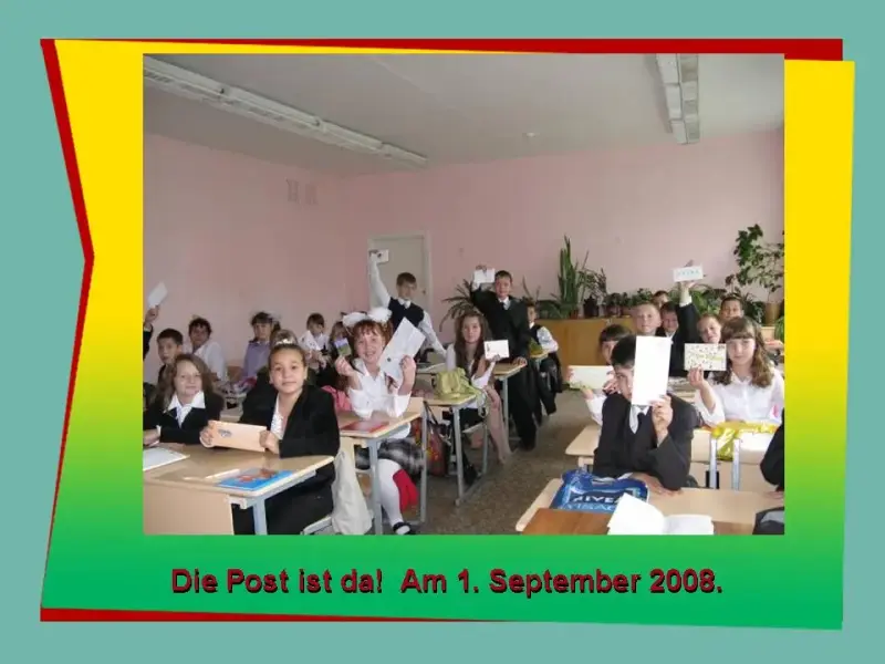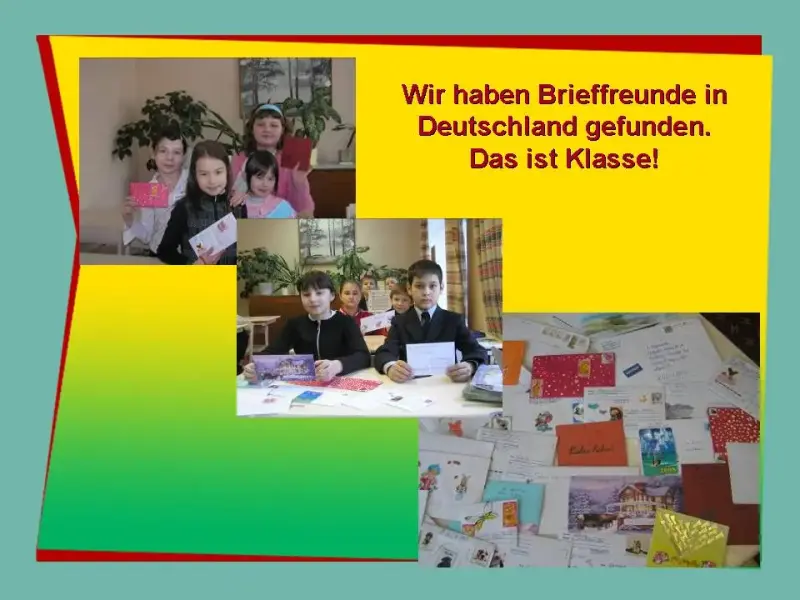 Оборудование: компьютер, видеопроектор, экран, письма немецких школьников, их фотографии, журналы, постеры, бумага для писем, конверты, заготовки открыток, цветная бумага, ножницы, клей.
