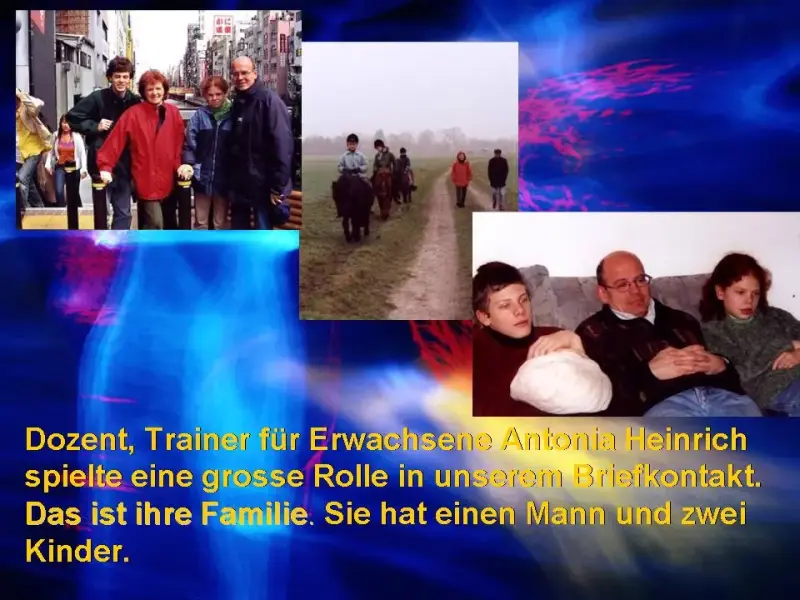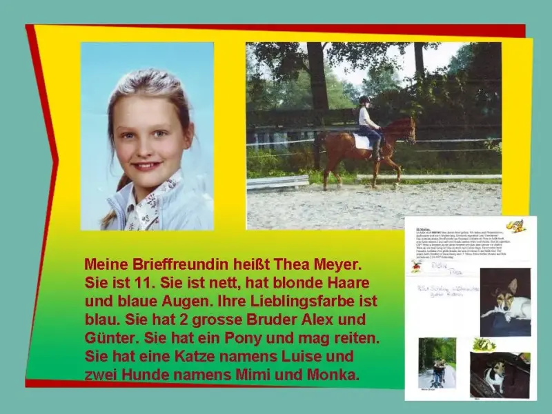 Marina: Meine Brieffreundin heißt Thea Meyer. Sie ist 11. Sie ist nett, hat blonde Haare und blaue Augen. Ihre Lieblingsfarbe ist blau. Sie hat 2 grosse Brüder Alex und Günter. Sie hat ein Pony und mag reiten. Sie hat eine Katze namens Luise und zwei Hunde namens Mimi und Monka.