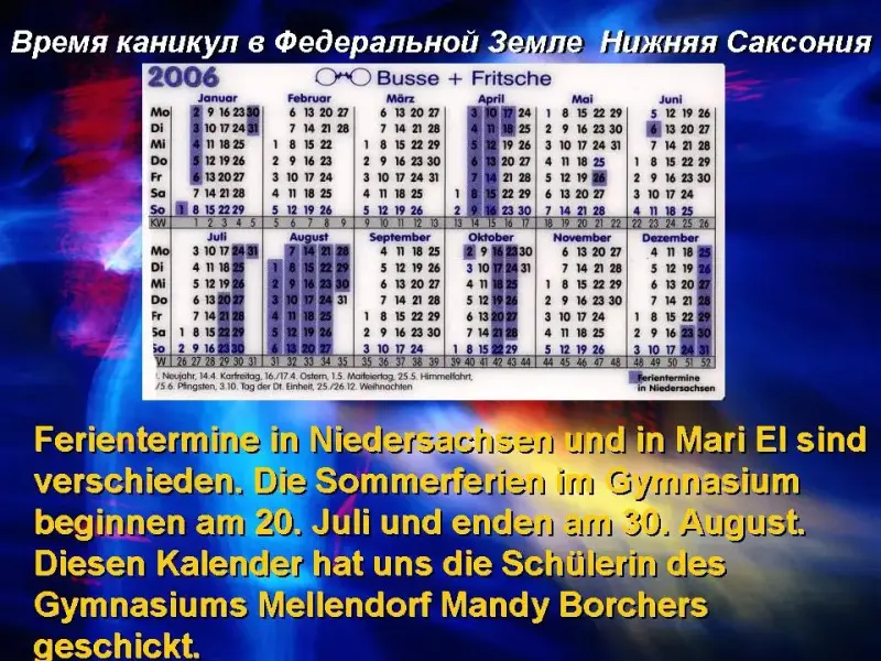 Ferientermine in Niedersachsen und in Mari El sind verschieden. Die Sommerferien im Gymnasium beginnen am 20. Juli und enden am 30. August.
