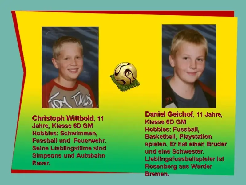 Wowa: Daniel spielt Fußball auch gern. Sein Lieblingsfussballspieler ist Rosenberg aus Werder Bremen. Seine Hobbies sind Fußball, Basketball, Playstation spielen. Er hat einen Bruder und eine Schwester. Seine Familie und er kommen aus Polen. Er sammelt Bilder mit Auto.