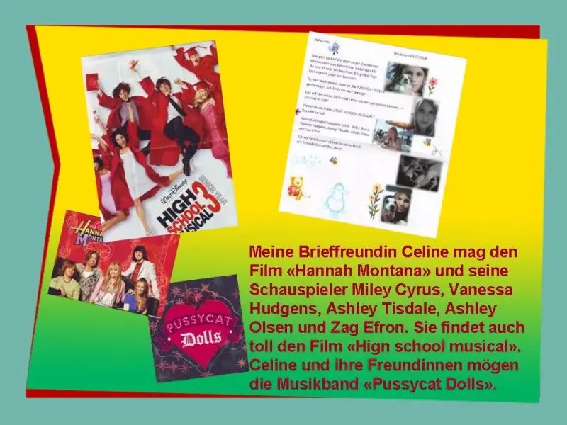 Lena: Meine Brieffreundin Celine mag den Film «Hannah Montana» und seine Schauspieler: Miley Cyrus, Vanessa Hudgens, Ashley Tisdale, Ashley Olsen und Zag Efron. Sie findet auch toll den Film «Hign school musical». Celine und ihre Freundinnen mögen die Musikband «Pussycat Dolls».