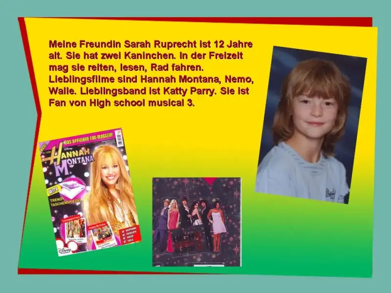 Natascha Kisseljowa: Meine Freundin Sarah Ruprecht ist 12 Jahre alt. Sie hat zwei Kaninchen. In der Freizeit mag sie reiten, lesen, Rad fahren. Ihre Lieblingsfilme sind Hannah Montana, Nemo, Walle. Sie ist Fan von High school musical 3.