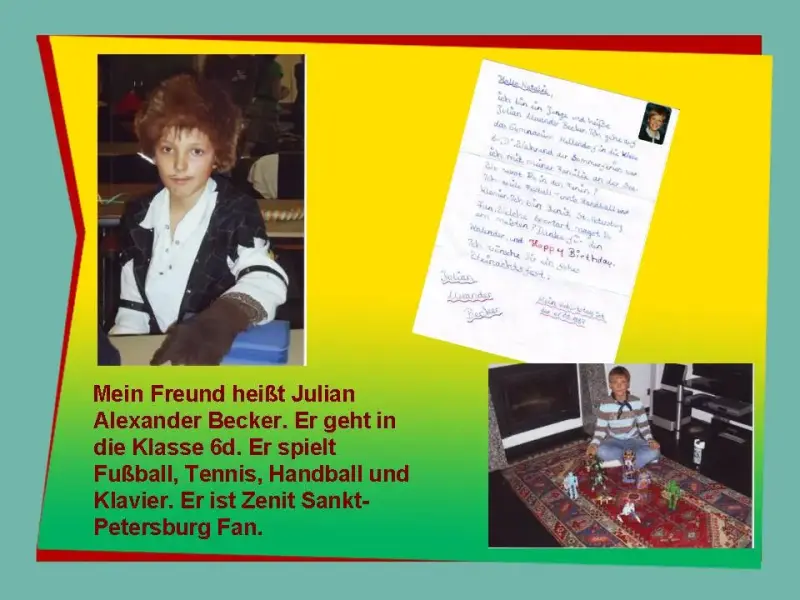 Natascha Kuklina: Mein Freund heißt Julian Alexander Becker. Er geht in die Klasse 6d. Er spielt Fußball, Tennis, Handball und Klavier. Er ist Zenit Sankt-Petersburg Fan.