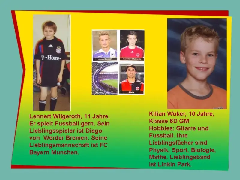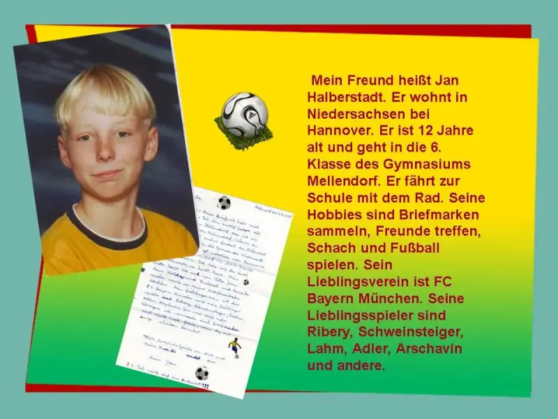 Pascha: Mein Freund heißt Jan Halberstadt. Er wohnt in Niedersachsen bei Hannover. Er ist 12 Jahre alt und geht in die 6. Klasse des Gymnasiums Mellendorf. Er fährt zur Schule mit dem Rad. Seine Hobbies sind Briefmarken sammeln, Freunde treffen, Schach und Fußball spielen. Sein Lieblingsverein ist FC Bayern München. Seine Lieblingsspieler sind Ribery, Schweinsteiger, Lahm, Adler, Arschavin und andere.
