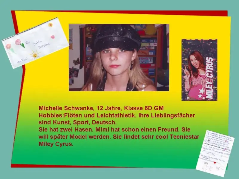 Mimi hat schon einen Freund. Sie will später Model werden. Sie findet sehr cool Teeniestar Miley Cyrus. Marina, mit wem stehst du im Briefkontakt?