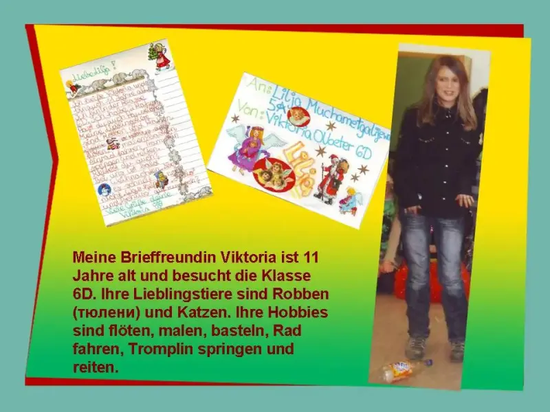 Lilja: Meine Brieffreundin Viktoria ist 11 Jahre alt und besucht die Klasse 6D. Ihre Lieblingstiere sind Robben (тюлени) und Katzen. Ihre Hobbies sind flöten, malen, basteln, Rad fahren, Tromplin springen und reiten.