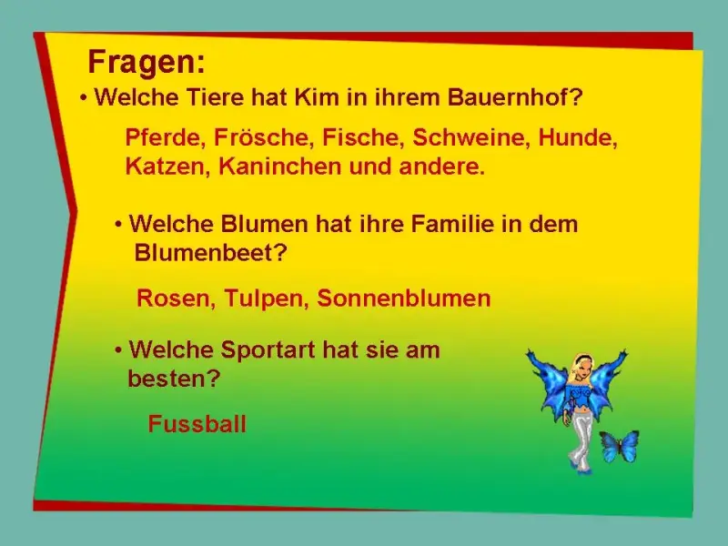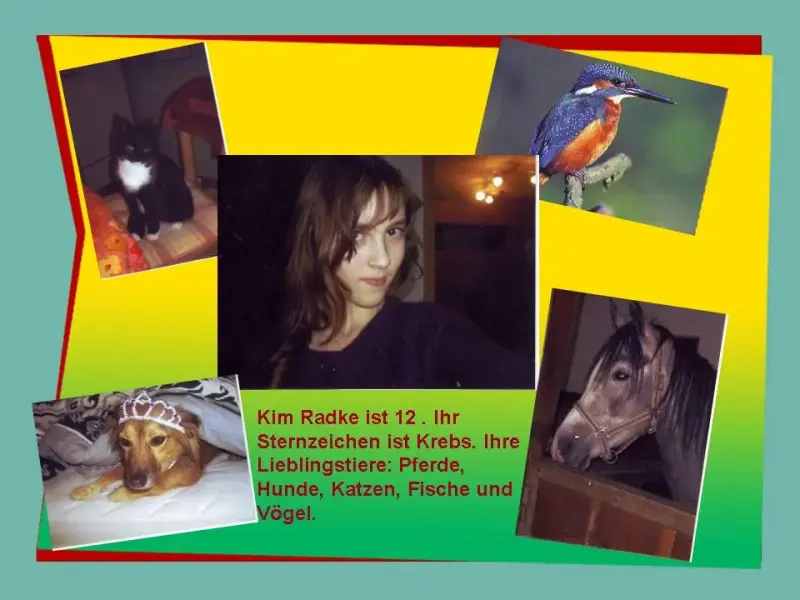 Wie geht's? Mein Name ist Kim.Ich habe 20 Pferde, 2 Frösche und 35 Fische im Teich, ein schwarz-weisses Schwein, 4 Hunde, 5 Katzen, 2 Kaninchen und 1 Hase, 1 Igel, mehrere Eichhörnchen und mehrere Rehe, denn wir haben einen Bauernhof und einen Wald. Ich wohne in einem Dorf. In dem Blumenbeet haben wir Rosen, Tulpen, Sonnenblumen, Ringelblumen und viele mehr. Wir haben keinen Fernsehen und Computer, nur einen Game-bay habe ich. Und Fussball ist das Beste!