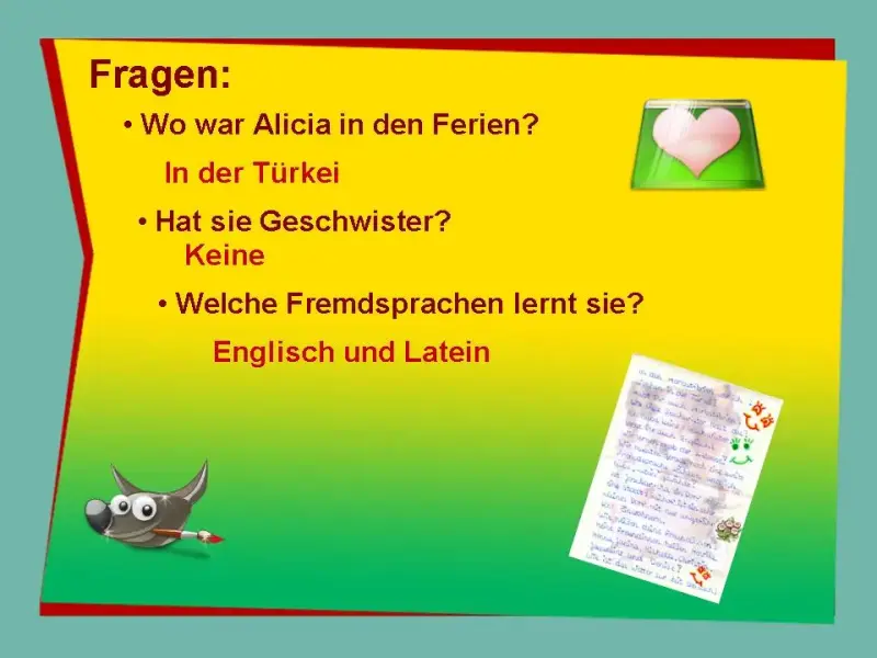 In den Herbstferien war ich 2 Wochen in der Türkei. Habt ihr auch Herbstferien? Wie viele Geschwister hast du? Ich habe keine Geschwister. Lernt ihr auch Englisch? Wir lernen es ab der dritten