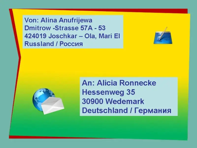 Jetzt legen wir unsere Geschenke in den großen Briefumschlag hinein. Zu Hause schreibt ihr Antworten, bringt mit und dann gehe ich auf das Postamt und schicke unsere Briefe nach Deutschland.