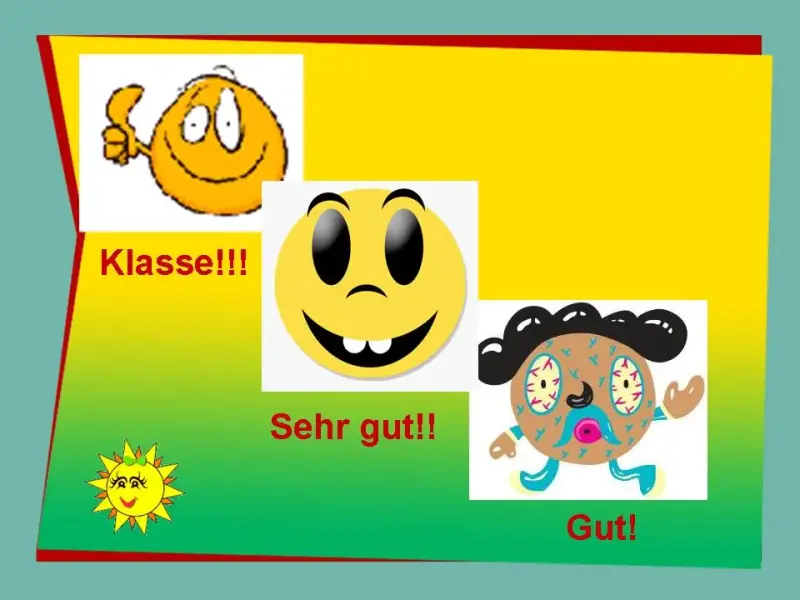 - А теперь посмотрите на эти рисунки (рисунки, изображающие лица с разным настроением, под которыми подписано: gut, sehr gut, klasse).