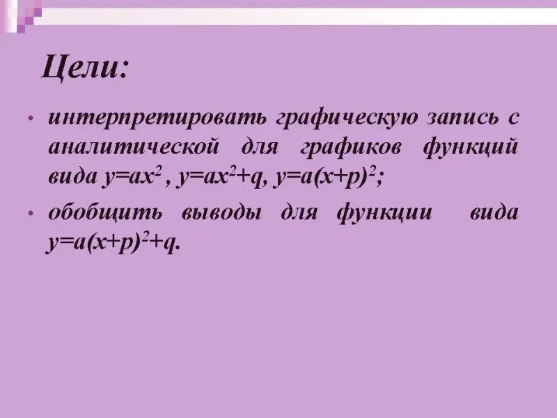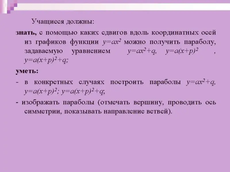 - интерпретировать графическую запись с аналитической для графиков функций вида у = ах2 , у = ах2 + q, у = а(х + p)2;