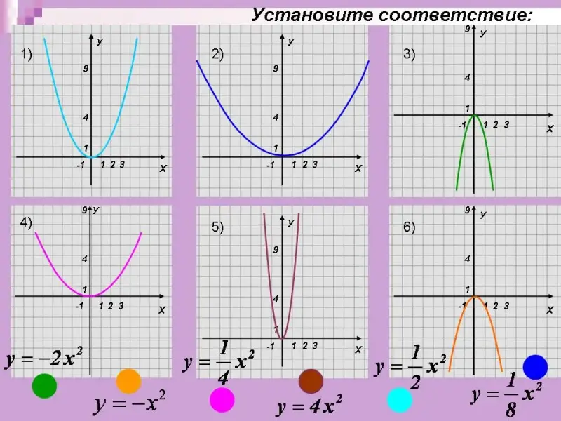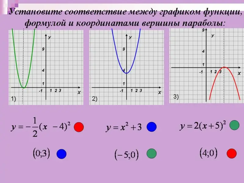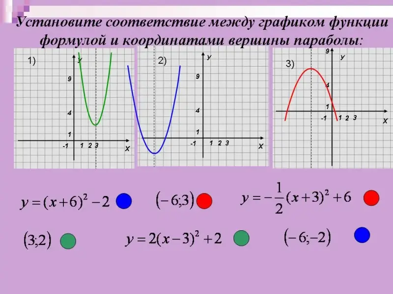 2. Установите соответствие между графиком функции, формулой и координатами вершины параболы.