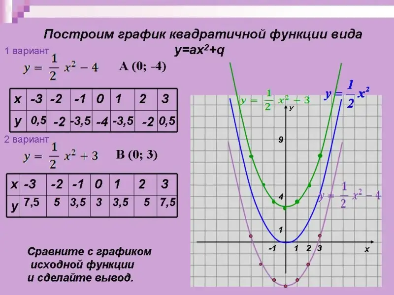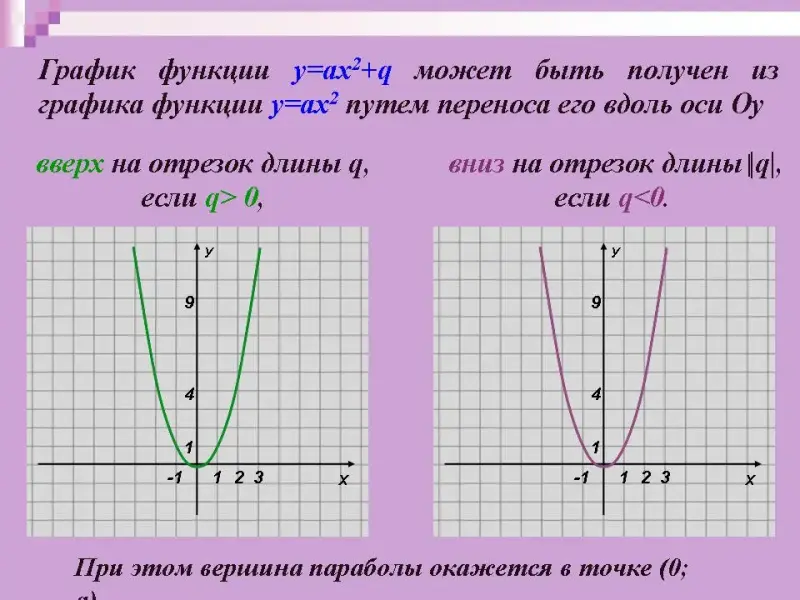 График функции у = ах2 + q может быть получен из графика функции у = ах2 путем переноса его вдоль оси Оу вверх на отрезок длины q, если q > 0, или вниз на отрезок длины | q |, если q < 0. При этом вершина параболы окажется в точке (0; q).