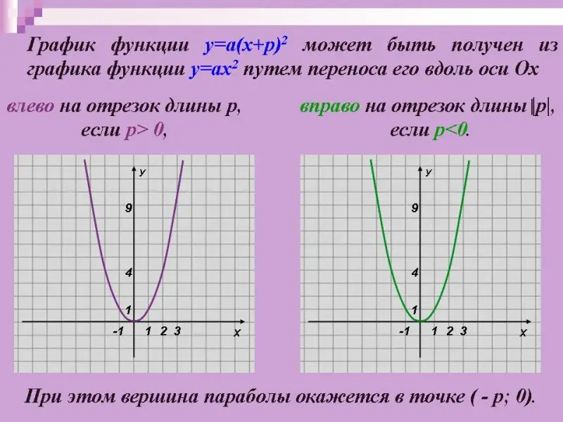 График функции у = а(х + p)2 может быть получен из графика функции у = ах2 путем переноса его вдоль оси Ох влево на