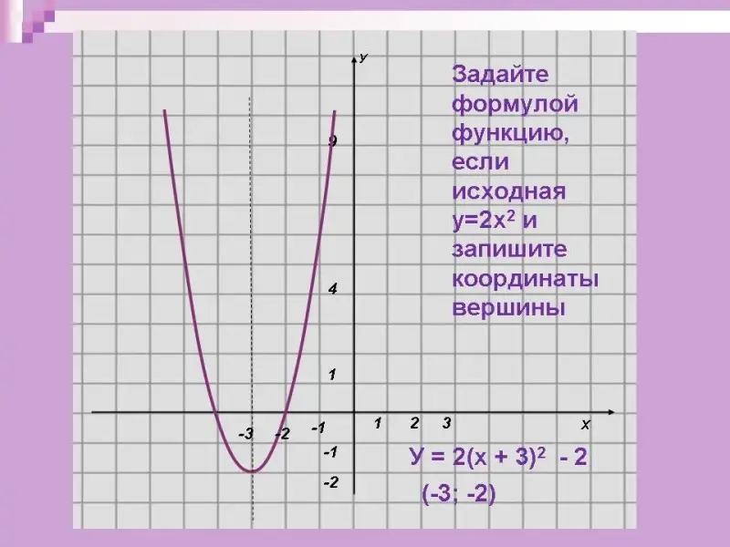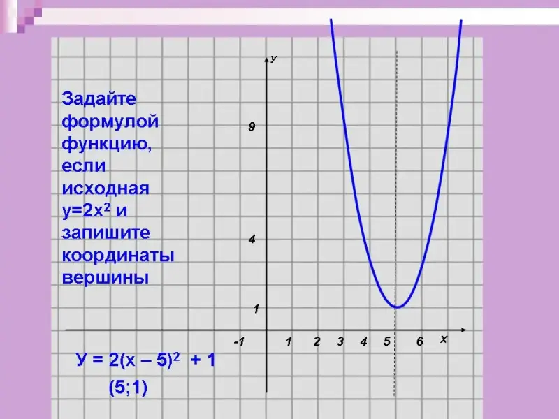 6. Задайте формулой функцию, если исходная у = 2х2 и запишите координаты вершины.
