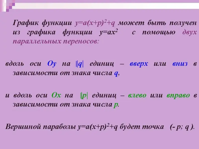 График функции у = а(х + p)2 + q может быть получен из графика функции у = ах2 с помощью двух параллельных переносов: вдоль оси Оу на | q | единиц - вверх или вниз в зависимости от знака числа q, и вдоль оси Ох на | p | единиц - влево или вправо в зависимости от знака числа p. Вершиной параболы у = а(х + p)2 + q будет точка (- p; q).