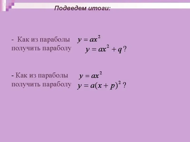 - с помощью каких сдвигов вдоль координатных осей из графиков функции у = ах2 можно получить параболу, задаваемую уравнением у = ах2 + q, у = а(х +