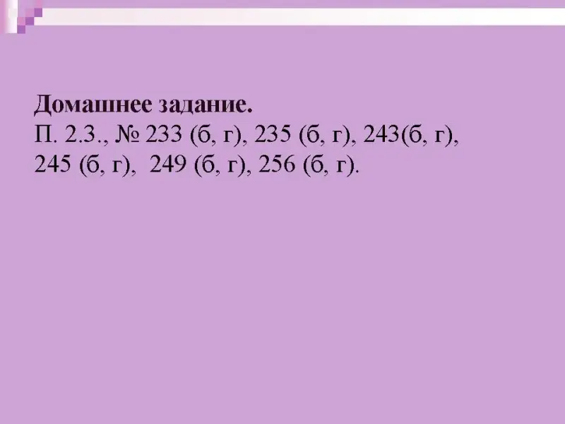 П. 2.3., № 233 (б, г), 235 (б, г), 243(б, г),245 (б, г), 249 (б, г), 256 (б, г). (Слайд 19).