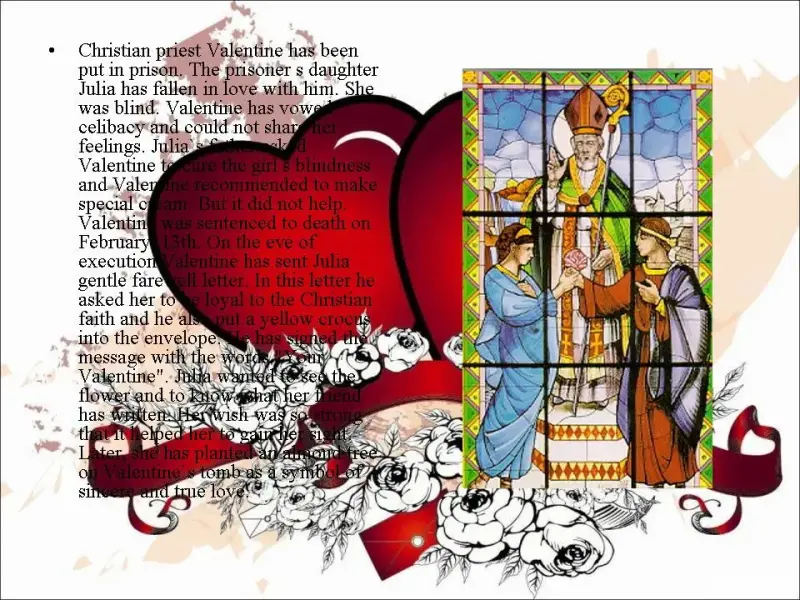 Переводчик: Существует красивая легенда о происхождении Дня всех влюбленных. Согласно этой легенде, римский император Клавдий II, живший в третьем веке нашей эры, был противником брачных союзов, так как они мешали его легионерам хорошо воевать. Поэтому император издал указ, запрещающий жениться. Священник Валентин, вопреки указу, продолжал тайно венчать влюбленных, за что был брошен в тюрьму и приговорен к смертной казни. Дочь тюремщика, увидев Валентина и узнав его историю, влюбилась в него. Священник ответил ей взаимностью. Так как видеться они не могли, влюбленные общались с помощью переписки. В день казни, 14 февраля 270 (по другим данным 269) года, священник послал своей возлюбленной последнюю записку с подписью "От Валентина". (Слайд 7)