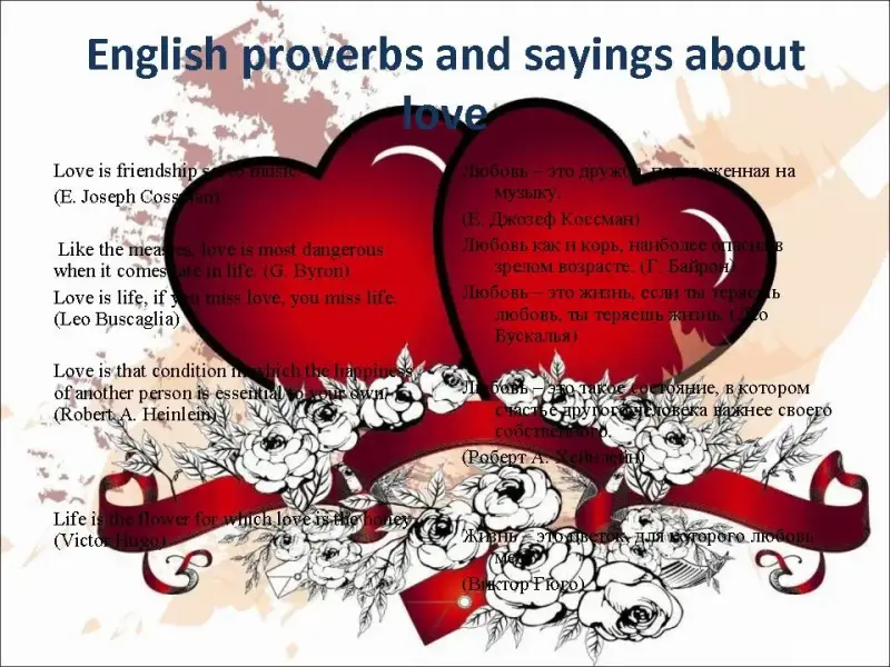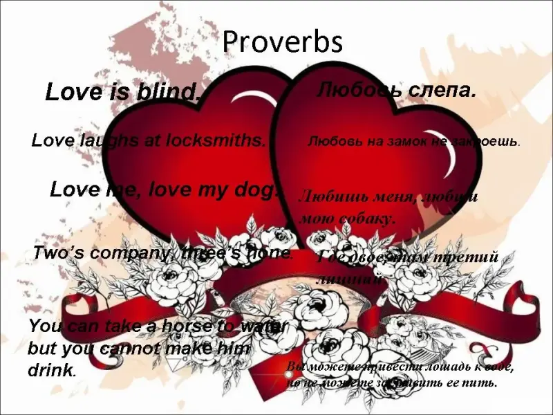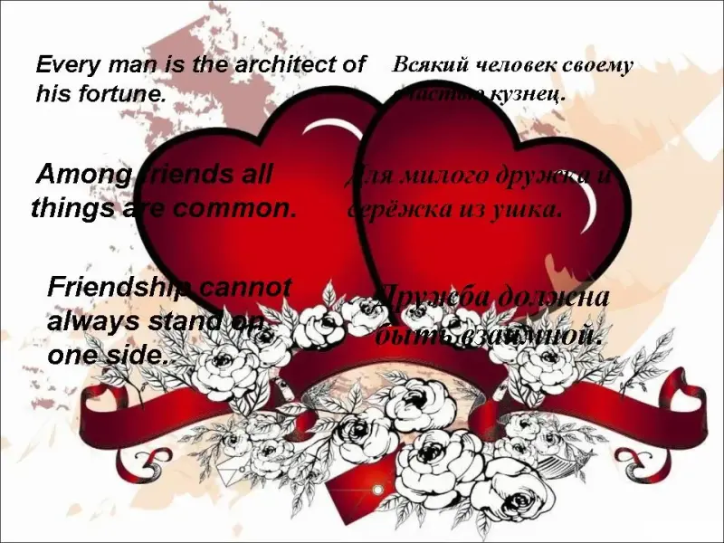 Girl: Let's remember proverbs about love and friendship. Look at these proverbs and find the Russian equivalents. (Слайды 9, 10)