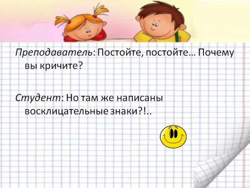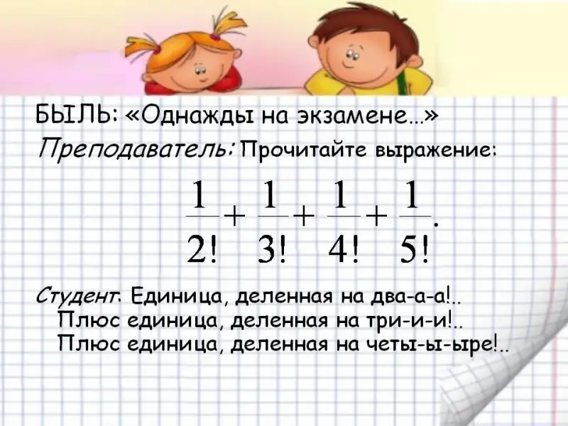 Студент: Единица, деленная на два-а-а!.. Плюс единица, деленная на три-и-и!..Плюс единица, деленная на четы-ы-ыре!.. Преподаватель: Постойте, постойте…Почему вы кричите? Студент: Но там же написаны восклицательные знаки?!.. Давайте узнаем, что обозначает символ восклицательного знака в математике.