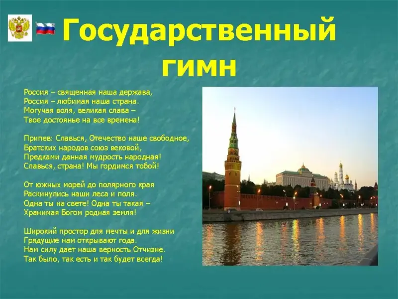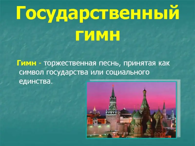 Гимн - главная песня страны. Национальные гимны вернее всего отражают характер нации. Гимн - торжественное музыкальное произведение, призванное сплачивать, вдохновлять всю нацию.Слова и музыка гимна России на протяжении многих веков изменялись несколько раз. Последним вариантом является гимн на слова С.В.Михалкова и композитора А.В.Александрова. При официальном исполнении Государственного гимна России присутствующие его слушают стоя, мужчины без головных уборов.