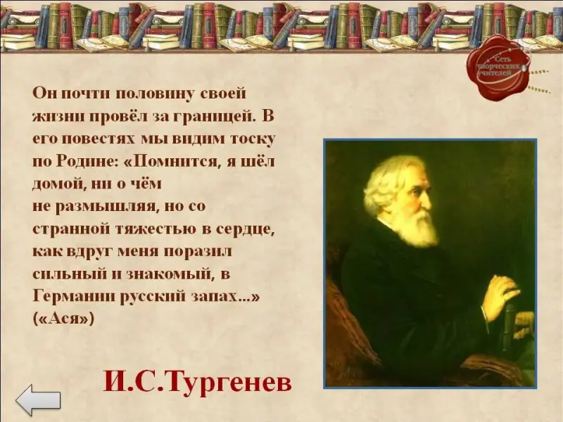 - Он почти половину своей жизни провёл за границей. В его повестях мы видим тоску по Родине: «Помнится, я шёл домой, ни о чём не размышляя, но со странной тяжестью в сердце, как вдруг меня поразил сильный и знакомый, в Германии русский запах…» («Ася»). (Тургенев И.С.)