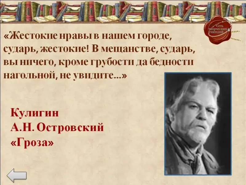 - «Жестокие нравы в нашем городе, сударь, жестокие! В мещанстве, сударь, вы ничего, кроме грубости да бедности нагольной, не увидите…» (Кулигин, Островский А.Н. «Гроза»)