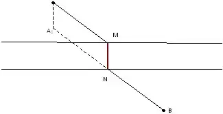 В каком месте надо построить мост MN через реку, разделяющую деревни А и В, так, чтобы дорога AMNB между деревнями была самой короткой? (Берега реки считаются параллельными, а мост перпендикулярным к ним)