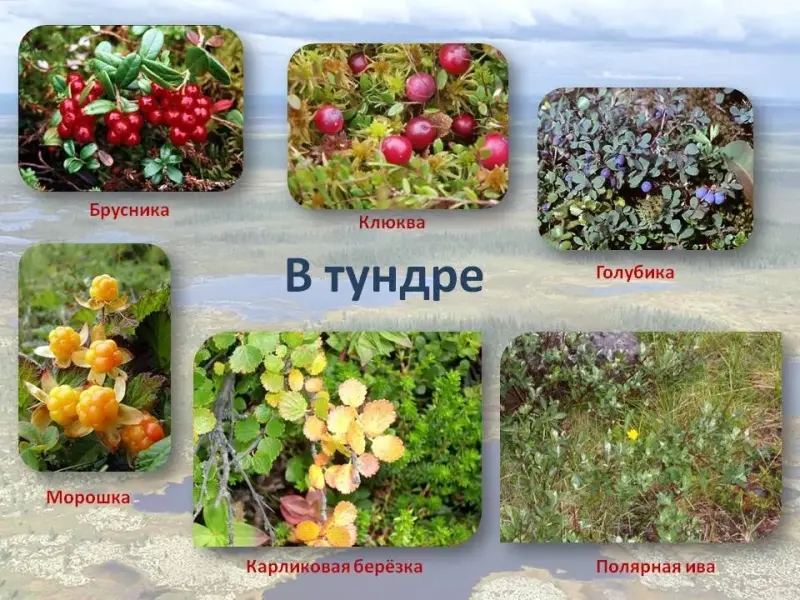 10 слайд. В тундре из-за короткого вегетационного периода преобладают многолетние растения и кустарнички с деревянистыми стеблями. Здесь поспевает много ягод: брусника,