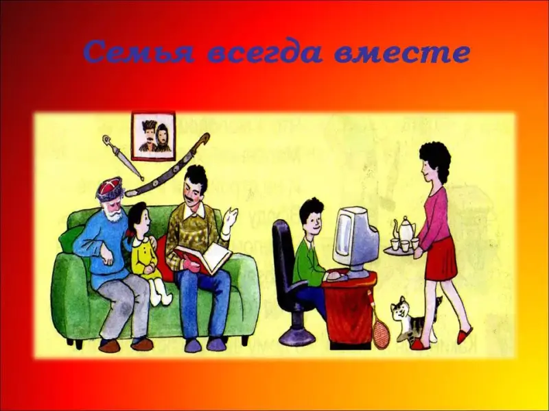 Каждая семья кратко рассказывает о себе. Например: «В нашей семье три поколения. Мы все вместе живём в доме, который строил ещё наш дедушка. Мы очень его чтим и любим. Наша бабушка - настоящая умелица, печёт замечательные пироги, одним из них мы с удовольствием угощаем сегодня всех. Мы гордимся своим сыном Ваней. Хоть он ещё и маленький, но помощник отличный: вытирает пыль, ходит в магазин, умеет дружить с товарищами».