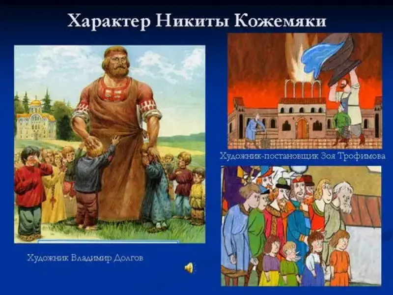 - Рассмотрим изображение, где Никита Кожемяка тушит пожар. В руках у него емкость, размером с двухэтажный дом, из которой льется вода. Художник намеренно изобразил героя огромного роста, показав его богатырскую силу. Богатырь одет в светлую рубаху, темно-серый фартук, штаны светло-серые, красные сапоги. Художник изобразил еще одну черту характера Никиты Кожемяки, что богатырь всегда готов прийти на помощь людям, оказавшимся в беде. В рисунке художника Владимира Долгова Никита Кожемяка богатырского телосложения, в красно-коричневой рубахе. На груди и на рукавах рубахи орнамент белого и красного цветов. Длинный коричневый фартук. Светлые волосы средней длины, подвязаны красной узкой лентой.