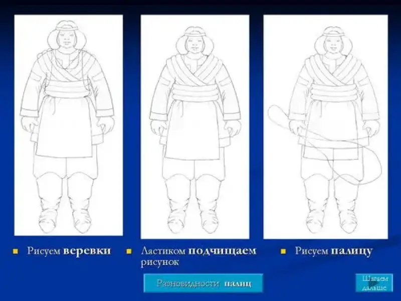 - У взрослого мужчины рост составляет около восьми голов. Исходя из этих идеальных пропорций головы и тела, можно приблизительно определить сравнительную величину других частей фигуры. Ноги начинаются на уровне середины фигуры, т.е. четырех голов. Границы проходят приблизительно через подбородок, грудь, талию и середину фигуры; бедра приходятся на середину высоты тела. Верхняя и нижняя части ноги составляют каждая по две "головы". Наиболее широкая часть у мужчины, как правило - плечи, составляющие две и одну треть "головы". Так как наша задача нарисовать богатыря в одежде, то необходимо учитывать его крупное телосложение и толщину одежды, обуви.