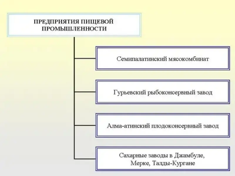 В годы индустриализации были построены крупные предприятия пищевой промышленности: Семипалатинский мясокомбинат, Гурьевский рыбоконсервный завод, Алма-Атинский плодоконсервный завод, сахарные заводы в Джамбуле, Мерке, Талды-Кургане.