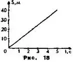 На рис. 18 изображены графики зависимости пути, пройденного телом при равномерном прямолинейном движении, от времени. Пользуясь графиком, заполните табл. 1. Подумайте и расскажите, как можно по графику зависимости пути от времени найти скорость движения? Задайте зависимость v(t) и S(t, постройте график зависимости скорости от времени в осях vоt .