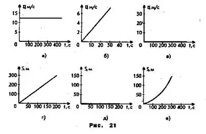 4. Среди графиков, изображенных на рис. 21, найдите те, которые могут соответствовать равномерному прямолинейному движению. Почему вы выбрали именно эти графики?
