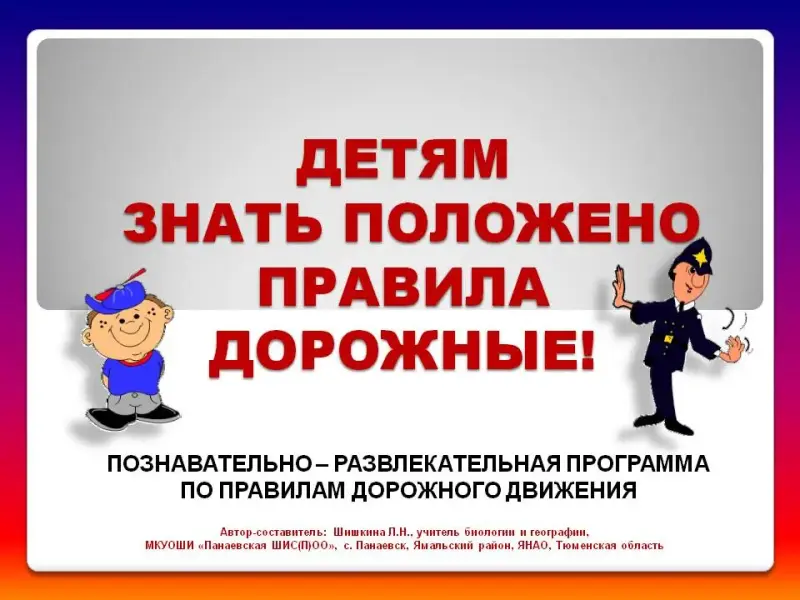 Рада приветствовать вас сегодня на нашей познавательно-развлекательной программе «Детям знать положено правила дорожные!» (слайд 1)