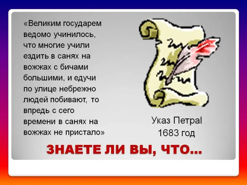 …в России правила дорожного движения на лошади были введены Петром 13 января 1683 года. Указ звучал так: «Великим государем ведомо учинилось, что многие учили ездить в санях на вожжах с бичами большими и едучи по улице небрежно людей побивают, то впредь с сего времени в санях на вожжах ездить не пристало» (слайд 4)
