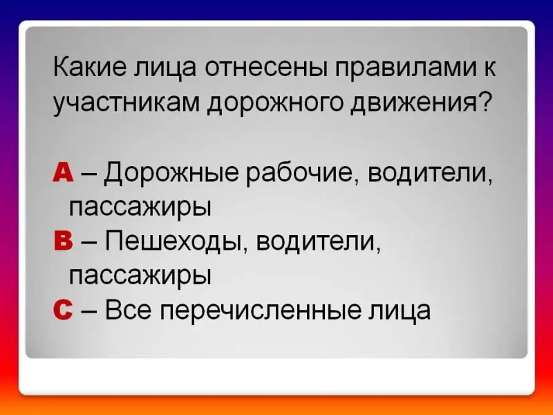 (Правильный ответ: В - Пешеходы, водители, пассажиры)