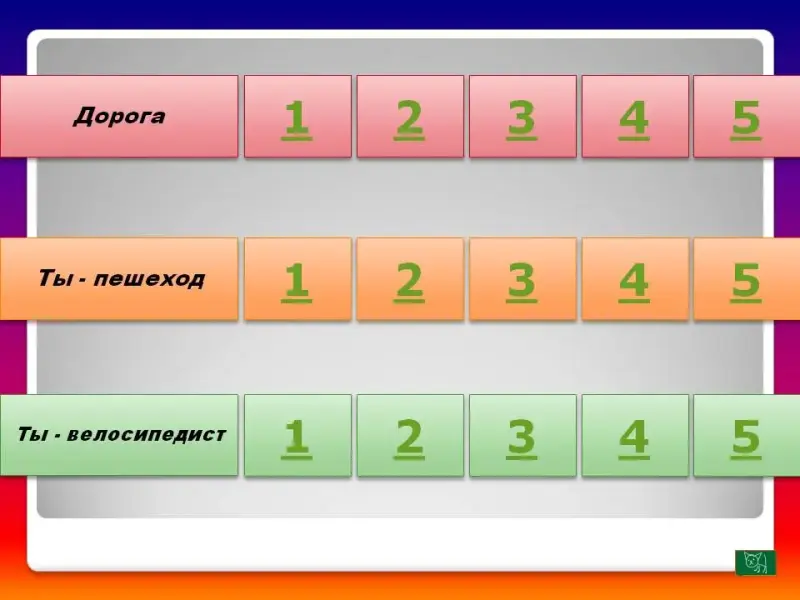 Викторина проводится по цепочке. Возможность для участия имеют в равной степени все три команды: «Красные», «Желтые», «Зеленые». 15 вопросов разделены на три сектора: «Дорога», «Ты - пешеход», «Ты - пассажир». В каждом секторе по 5 вопросов «стоимостью» от 1 до 5 баллов. Оценивание проводится согласно правильности и полноты ответа. В случае неверного ответа дается возможность другой команде поправить соперника. Этот же вариант предлагается, если команда не знает ответ на предложенный вопрос. Первой начать игру предоставляется той команде, которая правильно ответит на вопрос: