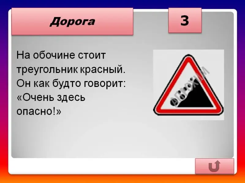 - На обочине стоит треугольник красный. Он как будто говорит: «очень здесь опасно!» («Падение камней»)