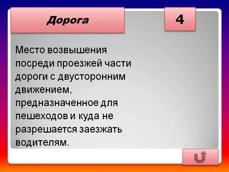 - Место возвышения посреди проезжей части дороги с двусторонним движением, предназначенное для пешеходов и куда не разрешается заезжать водителям. (Островок безопасности)