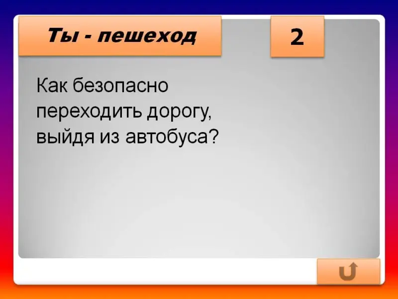 - Как безопасно переходить дорогу, выйдя из автобуса? (Дождаться, когда автобус отойдет от остановки на достаточное расстояние, и перейти дорогу)