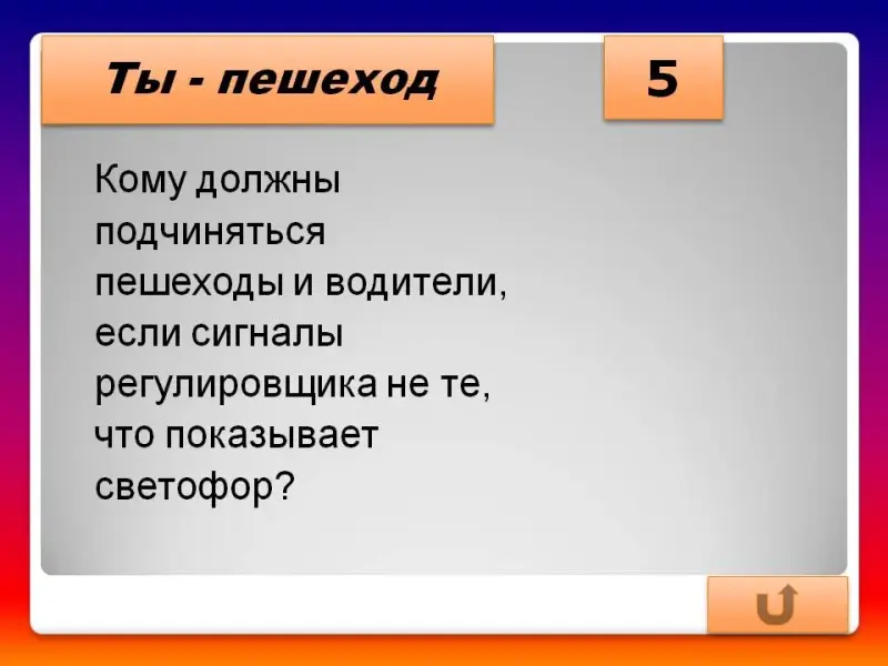 - Кому должны подчиняться пешеходы и водители, если сигналы регулировщика не те, что показывает светофор? (Только сигналам регулировщика)